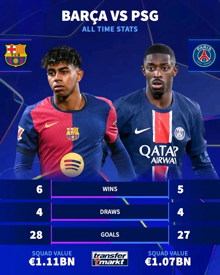 Beyond the pitch, their squad values also underline how evenly matched they are. According to Transfermarkt, Barcelona’s squad is valued at €1.11 billion, only slightly ahead of PSG’s €1.07 billion. This further demonstrates how both clubs are operating at the same level in terms of talent, investment, and ambition. With such parity, the outcome of their matches often comes down to fine margins and individual brilliance.