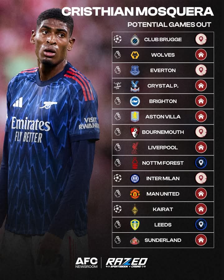 Arsenal defender Cristhian Mosquera is expected to miss several upcoming matches due to injury. The club is monitoring his recovery closely, but the young defender will be sidelined for a series of important fixtures.