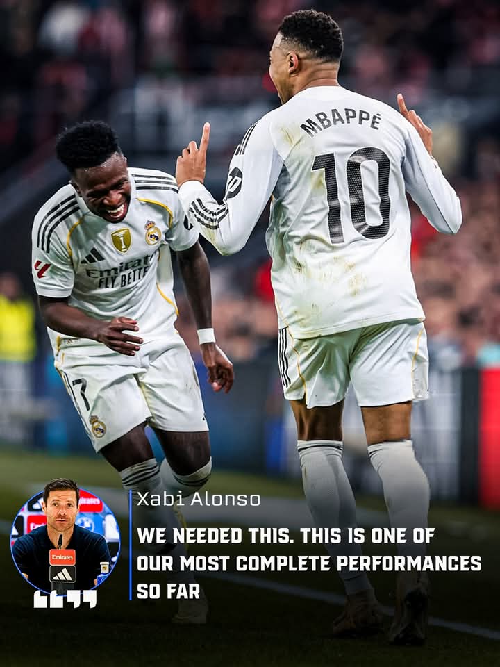 Alonso highlighted Kylian Mbappé’s outstanding contribution, noting his chemistry with Vinícius Júnior and the quality shown in both goals. He made it clear that Mbappé’s influence was central to the team’s attacking fluidity and overall confidence throughout the match.